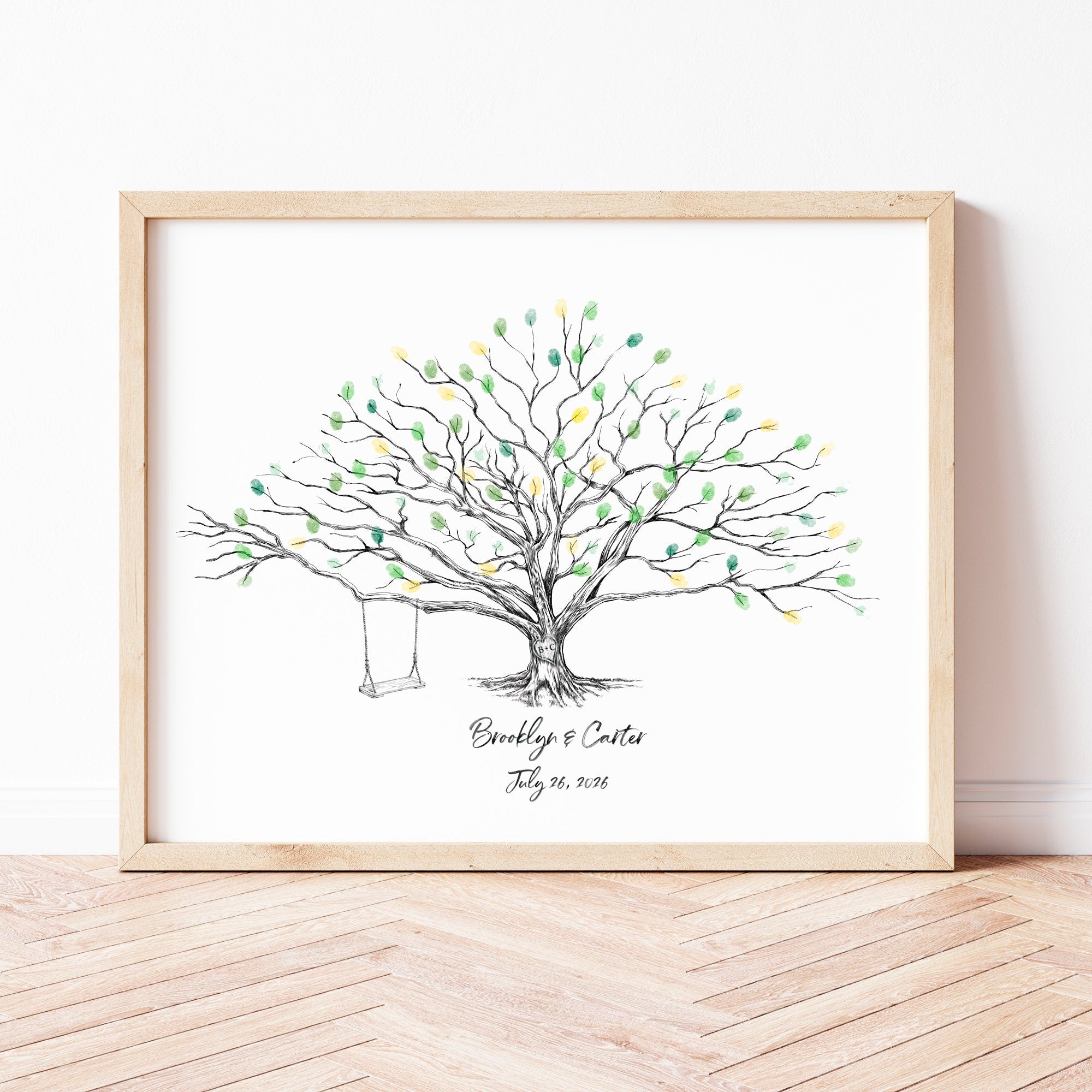 Our Low Oak with swing and initials in heart alternative guest book is professionally hand-drawn with care and precision so your guests can enjoy a lively, memorable and interactive fun time. Your fingerprint guestbook will provide you a record of your guests to commemorate your special day using their thumbprint or fingerprints to create leaves. And since our drawings are truly a piece of artwork, suitable for framing, you and viewers can appreciate your guestbook forever.