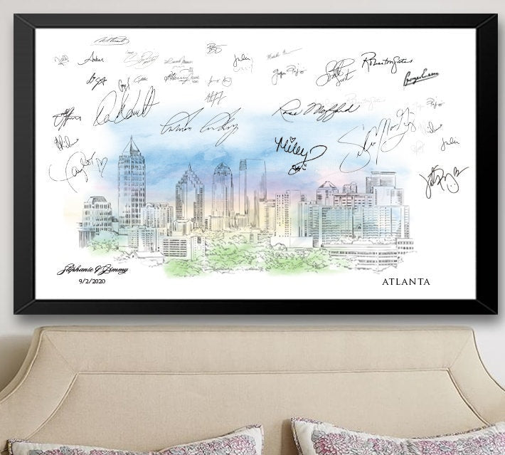 Our Atlanta Watercolor Skyline Guestbook print is professionally hand-drawn with care and precision so your guests can enjoy a lively, memorable and interactive fun time featuring the city of your choice. Your Guestbook will provide you signatures of your guests to commemorate your special day. And since our drawings are truly a piece of artwork, suitable for framing, you and viewers can appreciate your guestbook forever. Don't see your city? Just send convo us, and we probably have it ; )