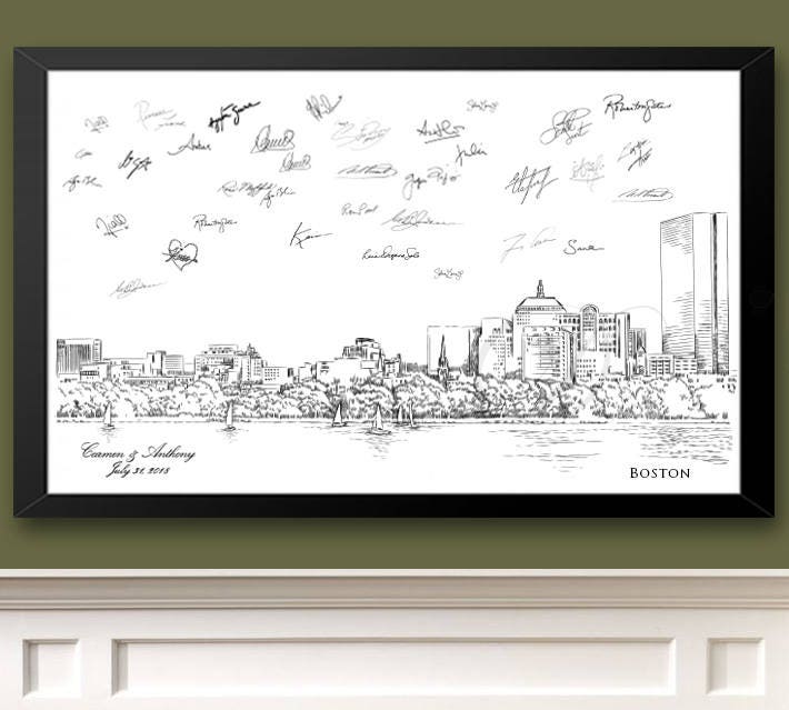 Our Boston Skyline Guestbook print is professionally hand-drawn with care and precision so your guests can enjoy a lively, memorable and interactive fun time featuring the city of your choice. Your Guestbook will provide you signatures of your guests to commemorate your special day. And since our drawings are truly a piece of artwork, suitable for framing, you and viewers can appreciate your guestbook forever. Don't see your city? Just send convo us, and we probably have it ; )