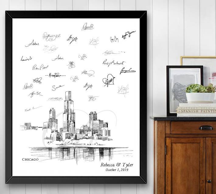 Our Chicago Skyline Guestbook print is professionally hand-drawn with care and precision so your guests can enjoy a lively, memorable and interactive fun time featuring the city of your choice. Your Guestbook will provide you signatures of your guests to commemorate your special day. And since our drawings are truly a piece of artwork, suitable for framing, you and viewers can appreciate your guestbook forever. Don't see your city? Just send convo us, and we probably have it ; )