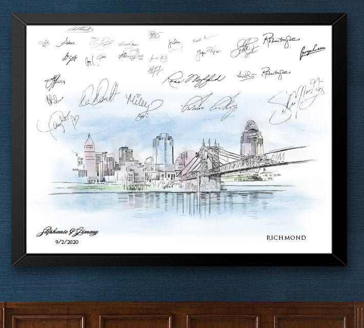 Our Cincinnati, OH Watercolor Skyline Guestbook print is professionally hand-drawn with care and precision so your guests can enjoy a lively, memorable and interactive fun time featuring the city of your choice. Your Guestbook will provide you signatures of your guests to commemorate your special day. And since our drawings are truly a piece of artwork, suitable for framing, you and viewers can appreciate your guestbook forever. Don't see your city? Just send convo us, and we probably have it ; )