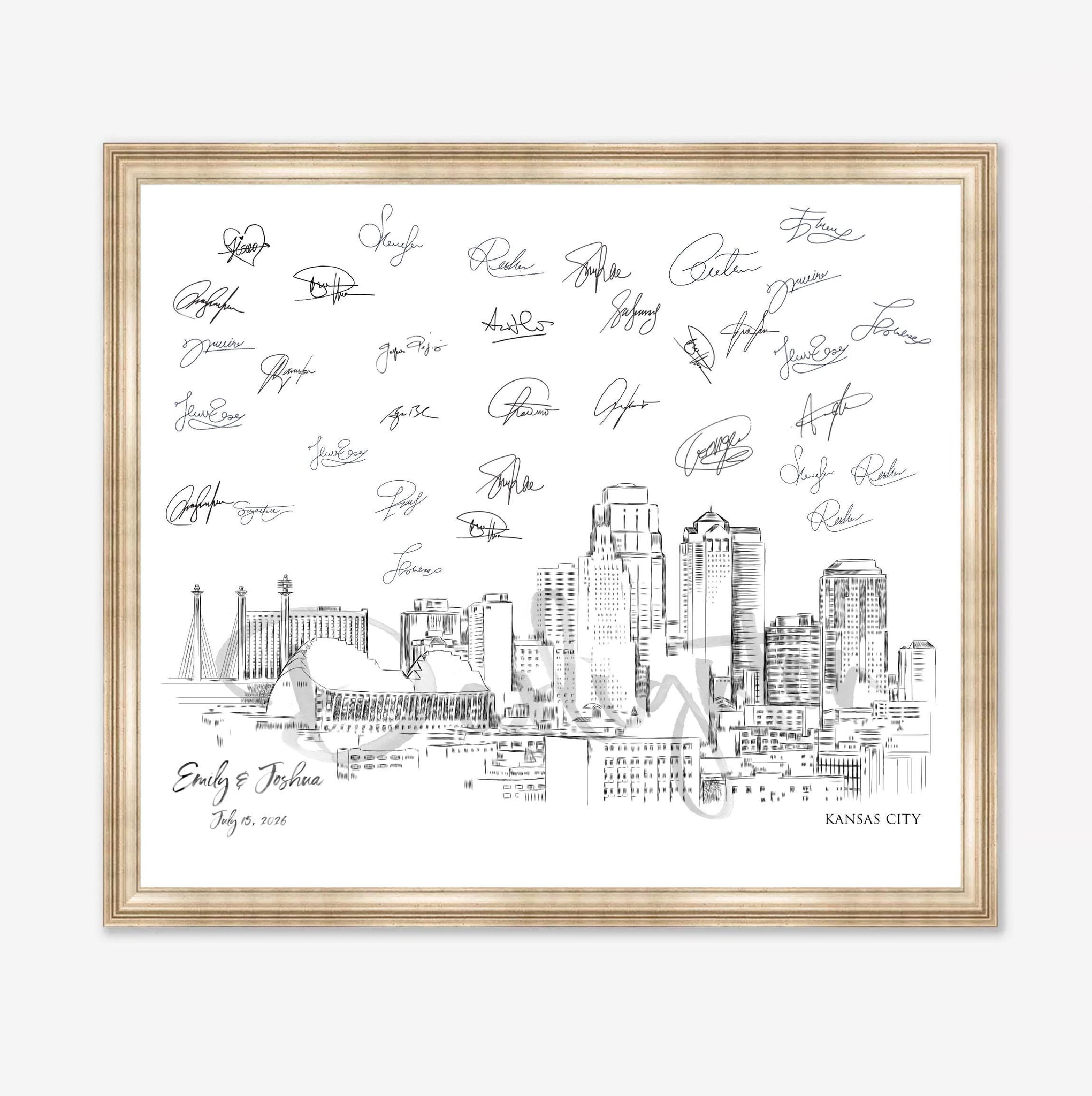 Our Kansas City Skyline Guestbook print is professionally hand-drawn with care and precision so your guests can enjoy a lively, memorable and interactive fun time featuring the city of your choice. Your Guestbook will provide you signatures of your guests to commemorate your special day. And since our drawings are truly a piece of artwork, suitable for framing, you and viewers can appreciate your guestbook forever. Don't see your city? Just send convo us, and we probably have it ; )