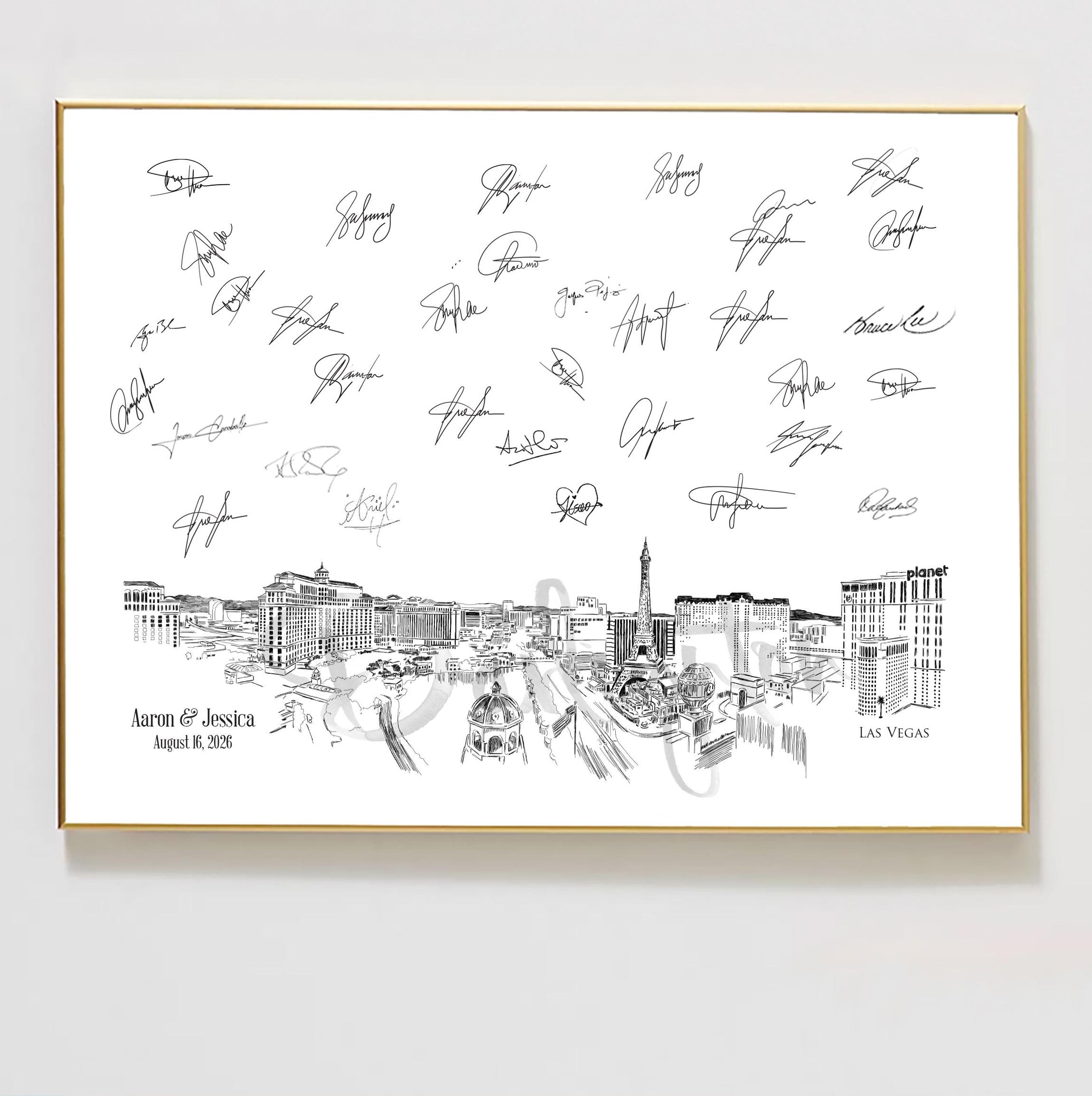 Our Las Vegas Skyline Guestbook print is professionally hand-drawn with care and precision so your guests can enjoy a lively, memorable and interactive fun time featuring the city of your choice. Your Guestbook will provide you signatures of your guests to commemorate your special day. And since our drawings are truly a piece of artwork, suitable for framing, you and viewers can appreciate your guestbook forever. Don't see your city? Just send convo us, and we probably have it ; )