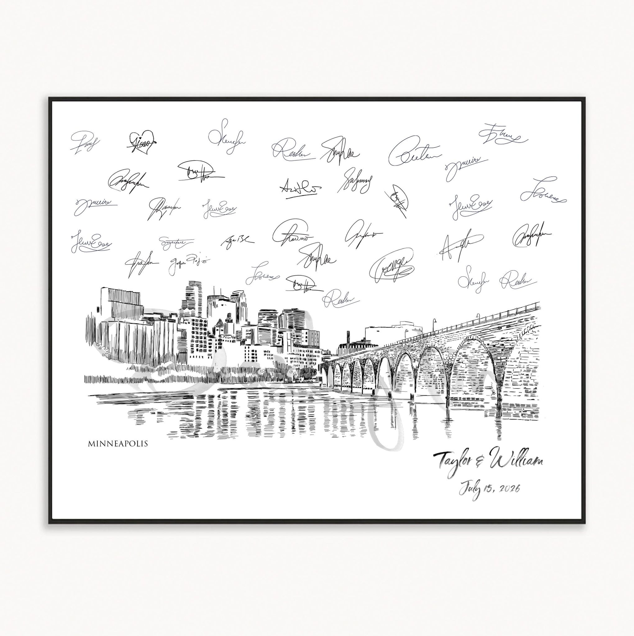 Our Minneapolis Skyline Guestbook print is professionally hand-drawn with care and precision so your guests can enjoy a lively, memorable and interactive fun time featuring the city of your choice. Your Guestbook will provide you signatures of your guests to commemorate your special day. And since our drawings are truly a piece of artwork, suitable for framing, you and viewers can appreciate your guestbook forever. Don't see your city? Just send convo us, and we probably have it ; )