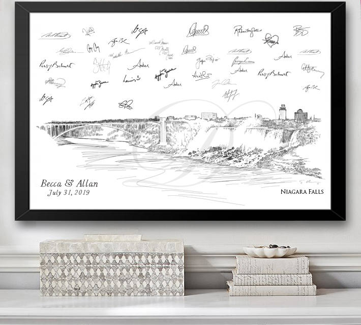 Our Niagara Falls Guestbook print is professionally hand-drawn with care and precision so your guests can enjoy a lively, memorable and interactive fun time featuring the city of your choice. Your Guestbook will provide you signatures of your guests to commemorate your special day. And since our drawings are truly a piece of artwork, suitable for framing, you and viewers can appreciate your guestbook forever. Don't see your city? Just send convo us, and we probably have it ; )