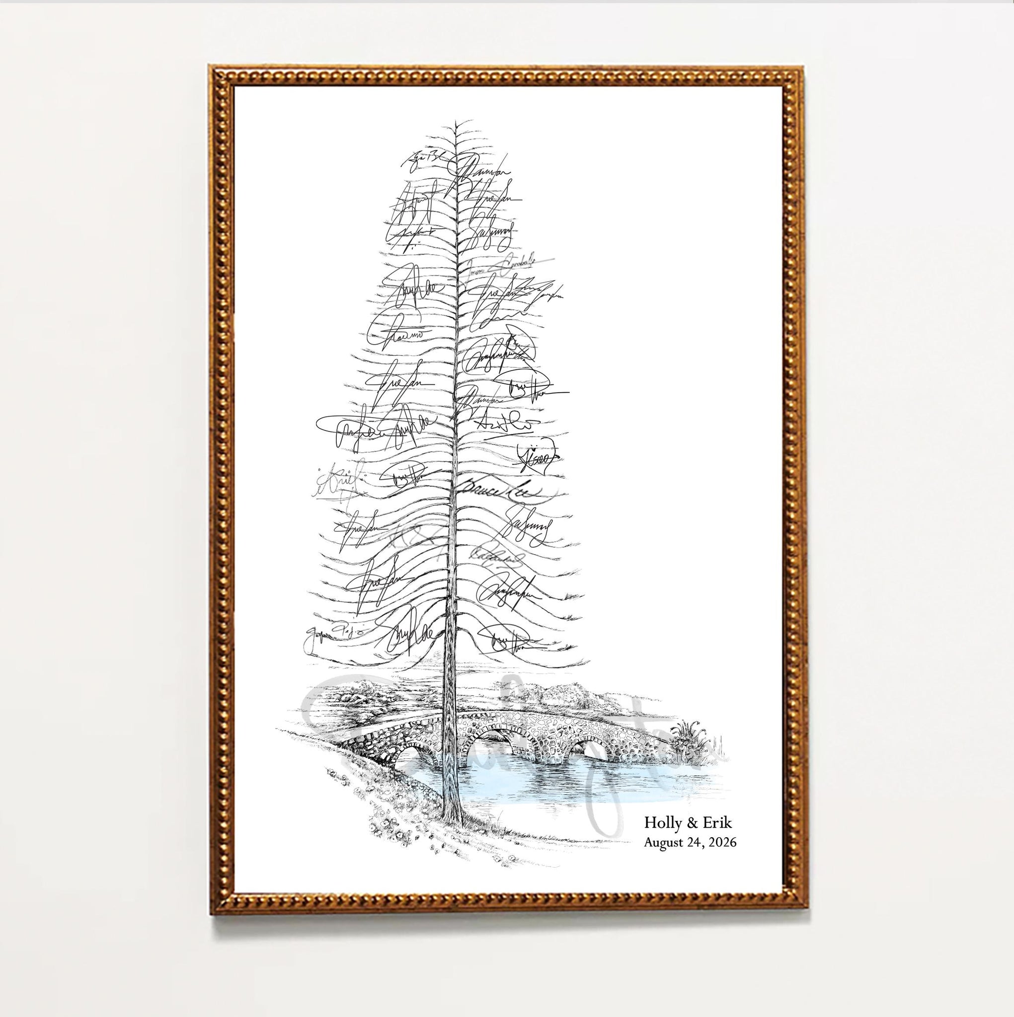 Our new Boho Pine Tree with bridge signature guest book is professionally hand-drawn with care and precision so your guests can enjoy a lively, memorable and interactive fun time. Your guests signatures will create the needles on the branches and will provide you a record of your guests to commemorate your special day. And since our drawings are truly a piece of artwork, suitable for framing, you and viewers can appreciate your guestbook forever.