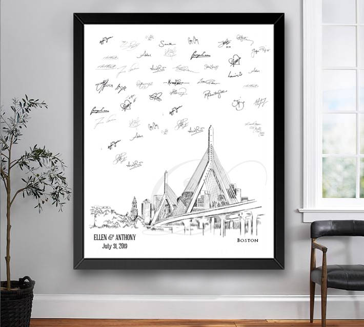 Our Zakim Bridge Guestbook print is professionally hand-drawn with care and precision so your guests can enjoy a lively, memorable and interactive fun time featuring the city of your choice. Your Guestbook will provide you signatures of your guests to commemorate your special day. And since our drawings are truly a piece of artwork, suitable for framing, you and viewers can appreciate your guestbook forever. Don't see your city? Just send convo us, and we probably have it ; )